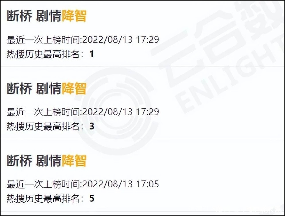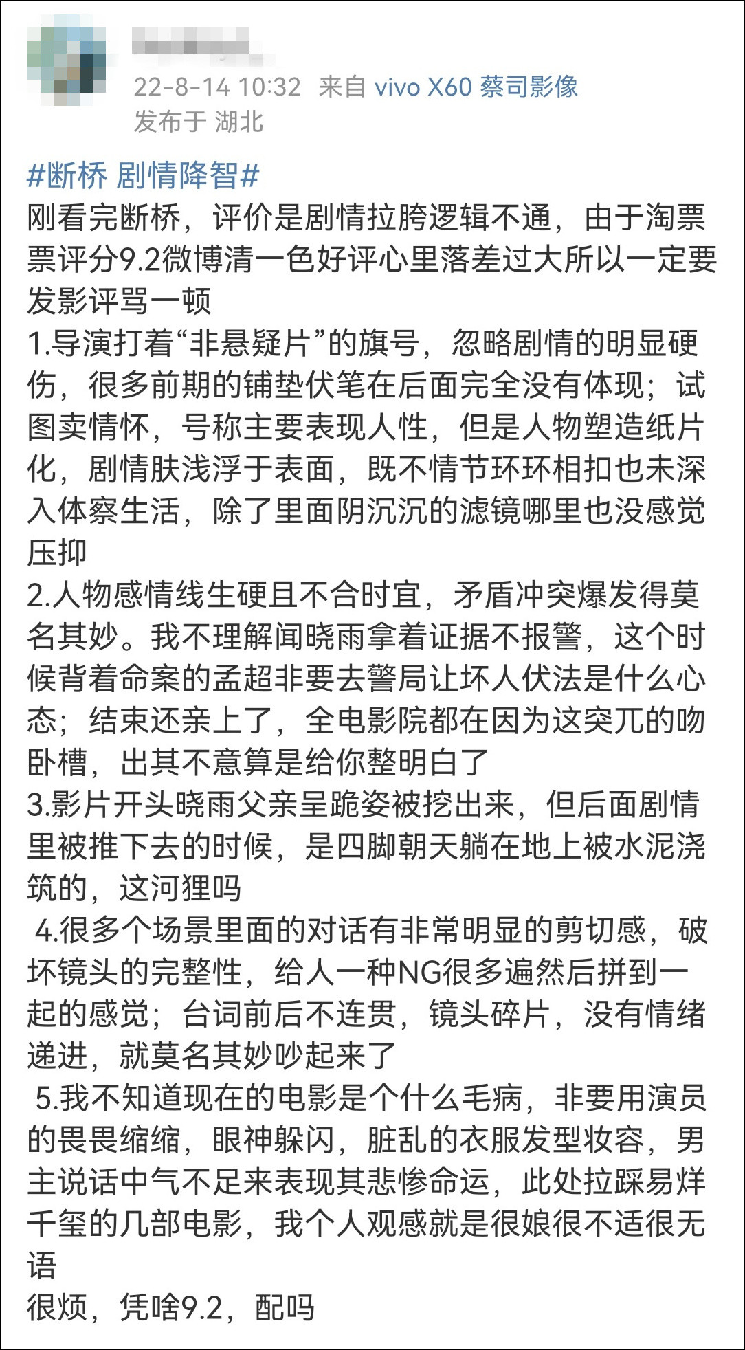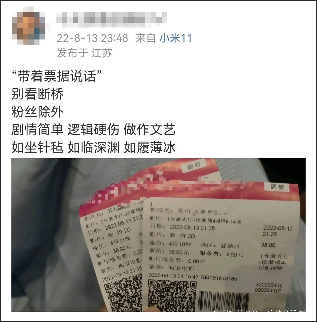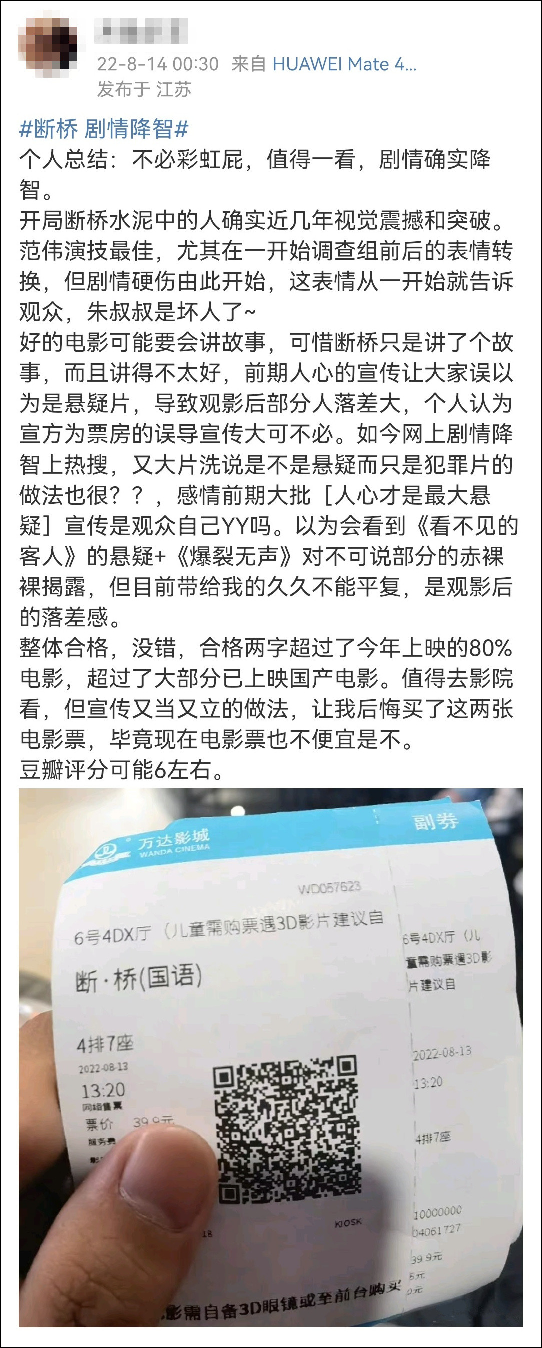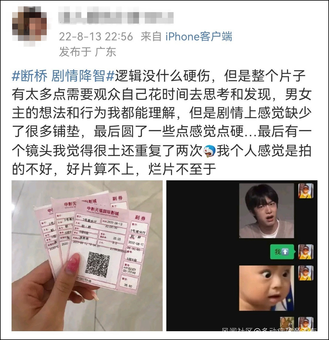 結果真的上映了,影片的票房表現尚可,口碑卻出現了一個明顯的滑坡:8月13日,吐槽《斷·橋》降智的話題詞登上微博熱搜。