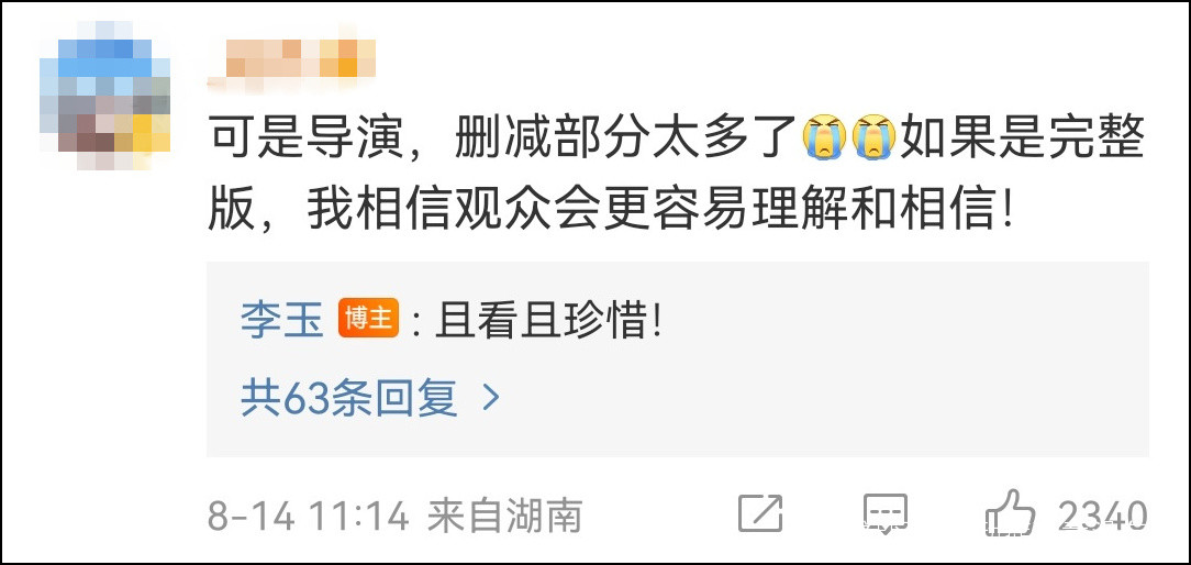 此外,導演李玉在回覆一個網友提出的“刪減部分太多了”時説,“且看且珍惜”,言外之意似乎是: