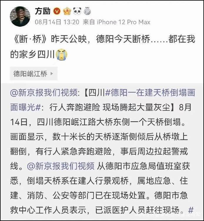 最後面想插播一個花絮,製片人方勵14日中午發了這樣的一條微博,在四川德陽一在建橋樑發生垮塌事故後↓↓