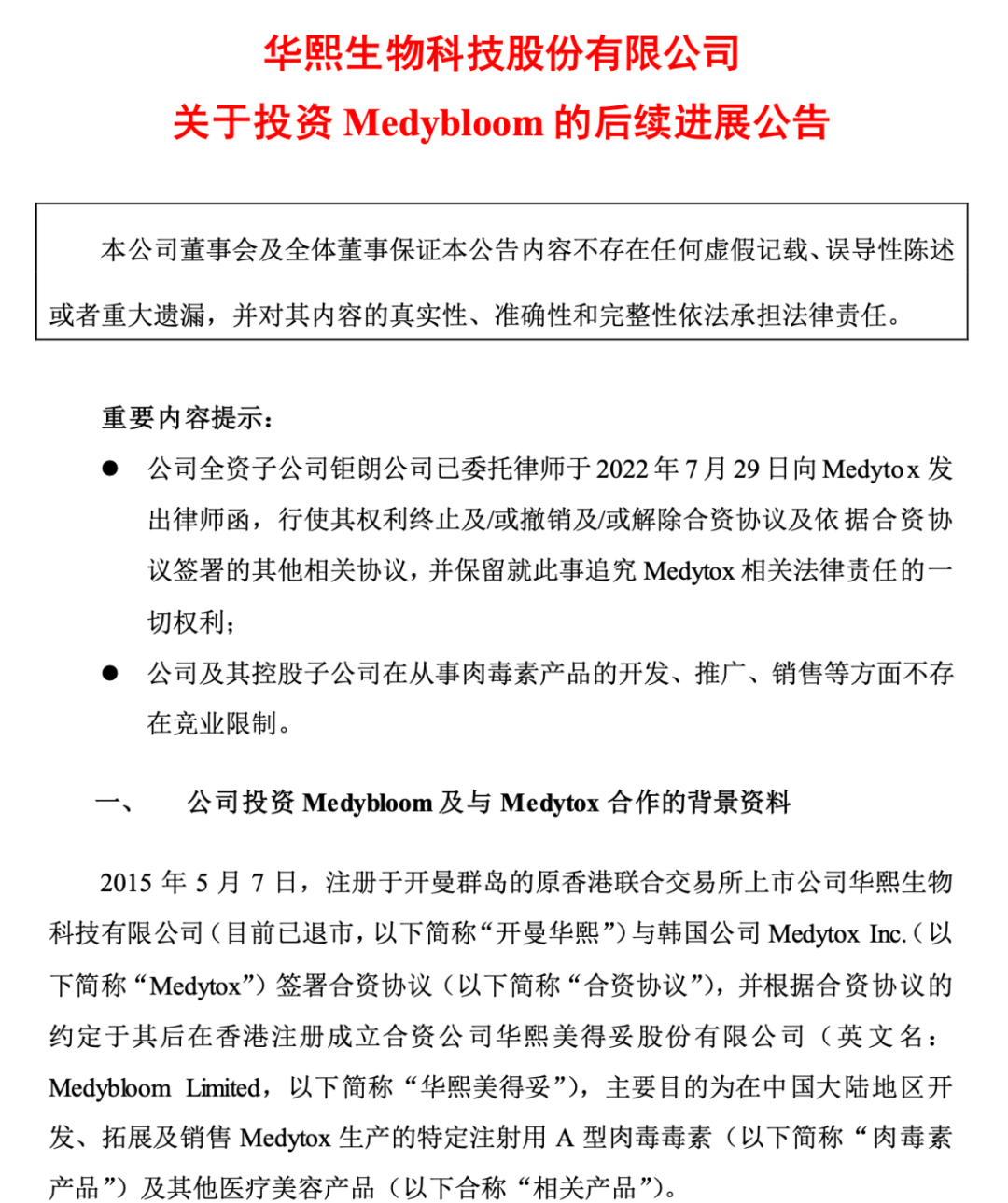韓國肉毒素公司Medytox,此前是韓國最大的肉毒素企業之一,旗下擁有Meditoxin等多款肉毒素產品。華熙生物於2015年開始推進與其展開合作,目的在於引進旗下肉毒素產品進入國內並獲得獨家代理權等。