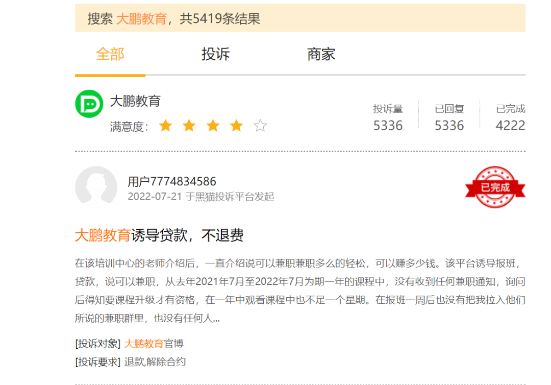 而事實上,鋅刻度發現,大鵬教育在“黑貓投訴”上已有5268條,投訴內容多為誘導消費、誘導貸款、退費難、虛假宣傳等內容,其下也不乏有誘導貸款的集體投訴內容。