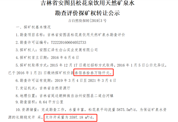 根據吉林省自然資源廳官方網站上的探礦權轉讓公示,每天開採的上限為3597噸,探礦權還有2年,那麼該礦產可供開採的水儲量約為262.5萬噸。