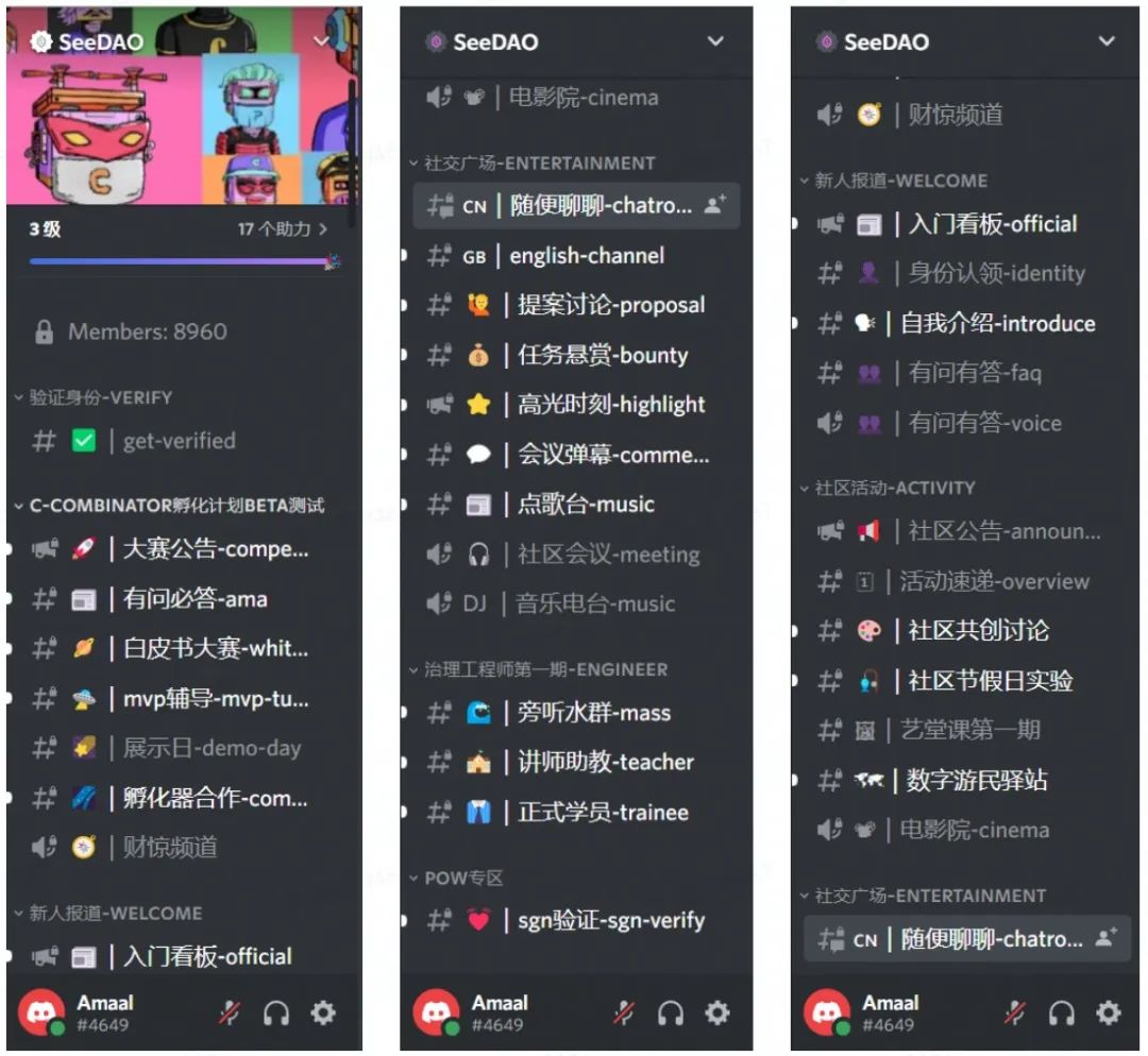 我加入 SeeDAO 的 Discord 服務器,首先看到 Discord 內左邊排列的着很多頻道,包含了 DAO 內的各種公共設施(新手引導、社交廣場等)、近期活動、項目等等。