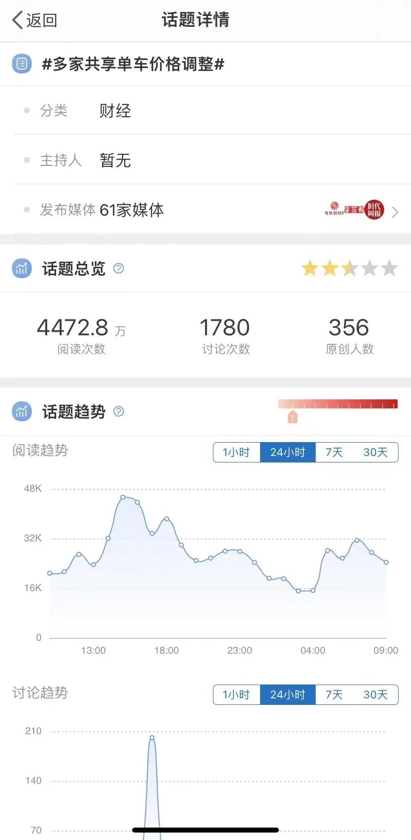“共享單車漲價”引起網友熱議,截至發稿,在微博上,“多家共享單車價格調整”話題得到4472.8萬閲讀量。