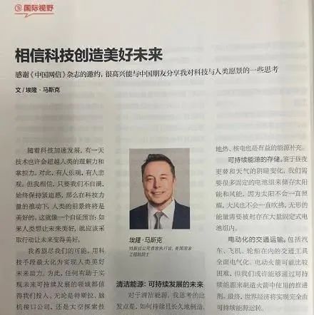 2. 《中國網信》雜誌刊馬斯克文章:科技創造美好未來
