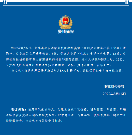 7. 湖南警方通報13歲女生遭強姦懷孕 嫌犯已被抓獲