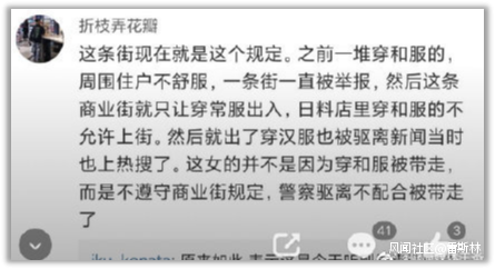 還有人表示,這條商業街就是規定只能穿常服進去。所以女孩不是穿和服被帶走,而是不遵守商業街規定,才被警察帶走的,包括之前穿漢服的也被驅離了。