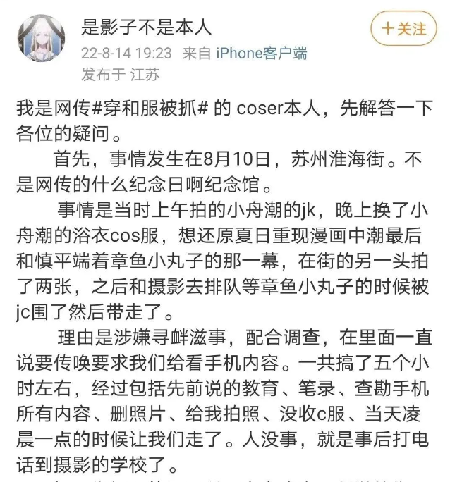 核心是,當地警方是否有權力,因為coser在一條日本風情街上穿和服就把人帶走。