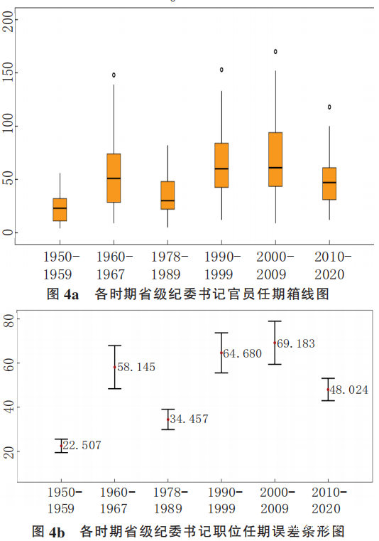 為了系統地瞭解新中國成立以來省級紀委書記任期的變化情況,我們仍然以每十年作為一個觀察週期,考察各時期省級紀委書記(剔除樣本中任職尚未結束以及任職起止時間缺失的個案)的任期變化情況。圖4a展示了不同時期省級紀委書記職位上官員任期的箱線圖,圖4b則報告了其平均值(即省級紀委書記的職位任期)與置信區間變化情況。圖4a顯示,在省級紀律檢查機關初創階段(建國初期)和恢復階段(改革開放初期),官員任期的離散程度較小,而在這兩個階段之後的階段,官員任期的離散程度分別都呈擴大之勢,但是在最近十年,官員任期的離散程度則又明顯變小,反映出省級紀委書記的任期受到了更為嚴格的制度約束,從而導致作為個體的省級紀委書記任期的異質性被削弱。而從圖4b中可以發現,省級紀委書記的職位任期在“文革”前和改革開放後都經歷了一次大幅的上升,但近十年則出現了小幅下降,即從69.183個月(約5.8年)降至48.024個月(約4年),這顯然低於黨章所規定的省級紀委書記每個任期為5年的標準,由此反映出2010年以來(尤其是2012年黨的十八大以來)省級紀委書記這一職位有了更快的流動率。