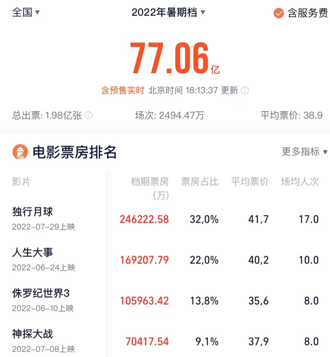 在這樣基礎下,暑期檔被賦予了格外重要的意義,它承載着召回觀眾、振興市場的期待。隨着《侏羅紀世界3》《人生大事》《神探大戰》《獨行月球》等影片的先後上映,令大盤重新回暖。