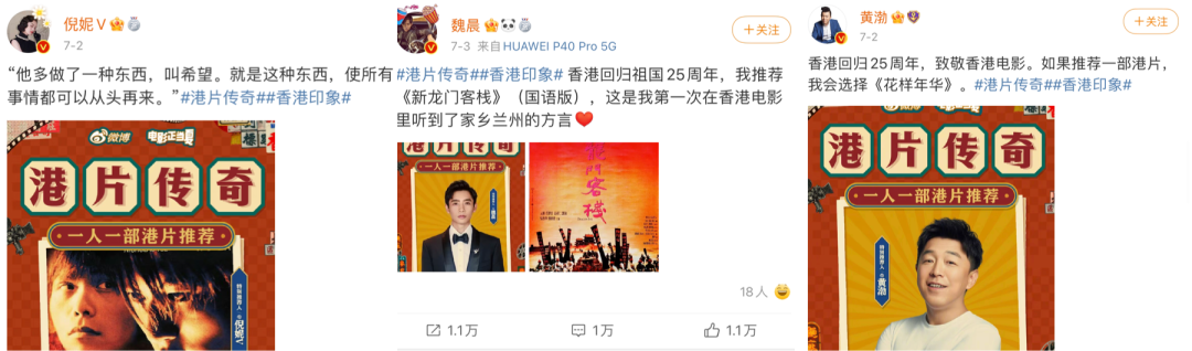 首先,微博藉助社會熱點,將其與大眾的電影記憶相連接,喚起觀眾重回影院的意願。比如7月1日恰逢香港迴歸25週年紀念日,微博發起了“港片傳奇”專題活動,邀請黃渤、倪妮等明星以及知名導演、港片IP藍V擔任港片特別推薦人,一人推薦一部港片。同時發起數場以港片為主題的直播連麥,討論大眾印象裏的經典好片。在喚醒大眾港片記憶的同時,也為《神探大戰》《七人樂隊》等暑期檔正上映的港片進行了潛移默化的連帶營銷,熱搜上榜次數共32次,相關博文總閲讀量達22.27億。