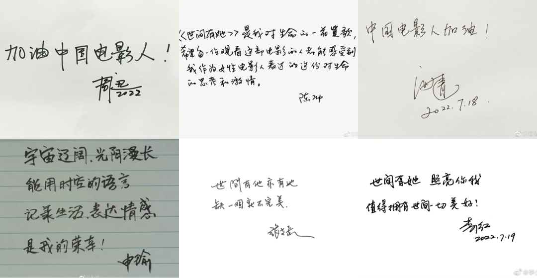 在微博電影之夜前夕,微博也攜手12位女性影人,為中國電影行業送出手寫寄語。9月9日,由張艾嘉、李少紅和陳沖三位華語女導演執導的影片《世間有她》即將上映,影片也發佈了“她力量版”預告片,為“電影她力量”活動助力。