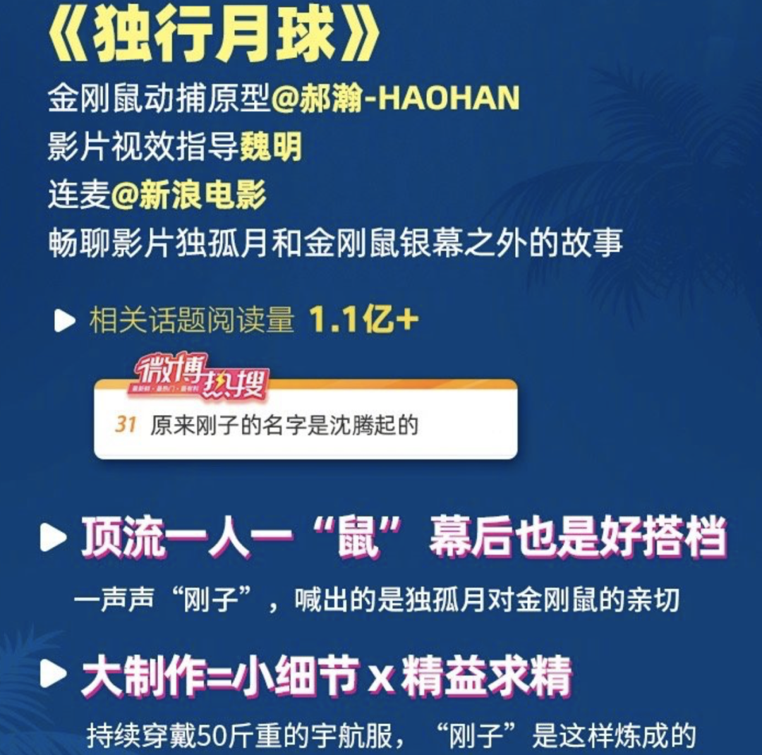 細化到每部影片具體的營銷動作上,微博為暑期檔電影舉辦了微首映直播,由電影主演直播連麥,分享影片拍攝的幕後趣事,通過明星效應帶動觀眾觀影熱情。《明日戰記》主演古天樂在直播中分享了探索科幻類型片的心得,他認為對科幻的探索本身是無價的,總觀看量超過453萬。而《獨行月球》劇組則邀請到扮演金剛鼠的演員郝瀚和視效指導魏明直播連麥,為大家講解“剛子”這一令人印象的角色是如何煉成的。
