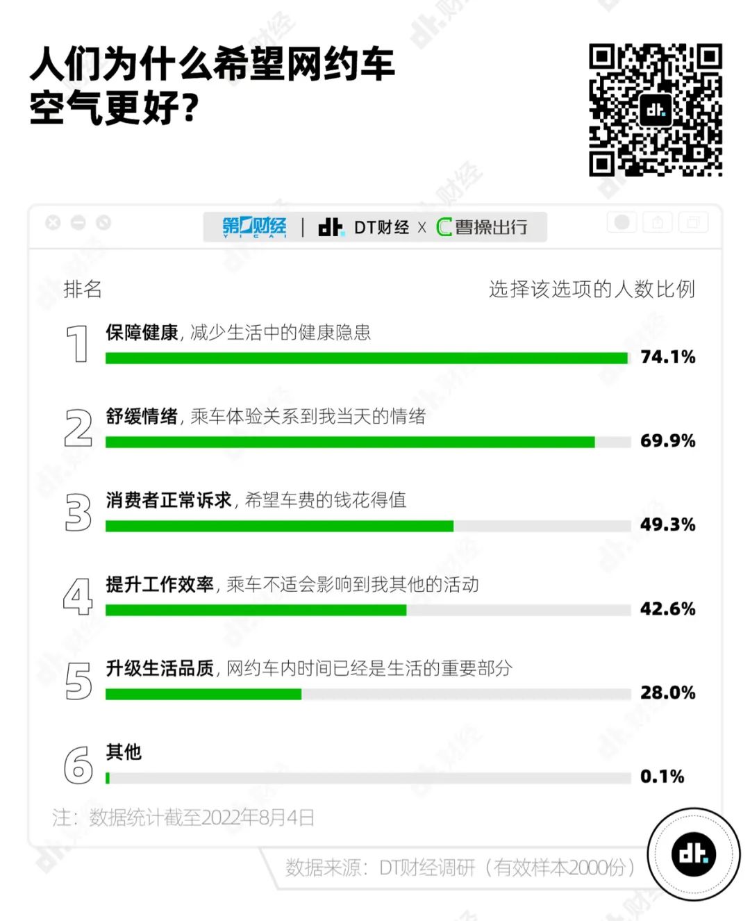總地來説,有相當比例的乘客把車內空氣作為網約車消費體驗的一部分,他們對乘坐網約車的預期不止於“到達目的地”,更多把網約車出行視為從多方面提升自己生活體驗的消費。