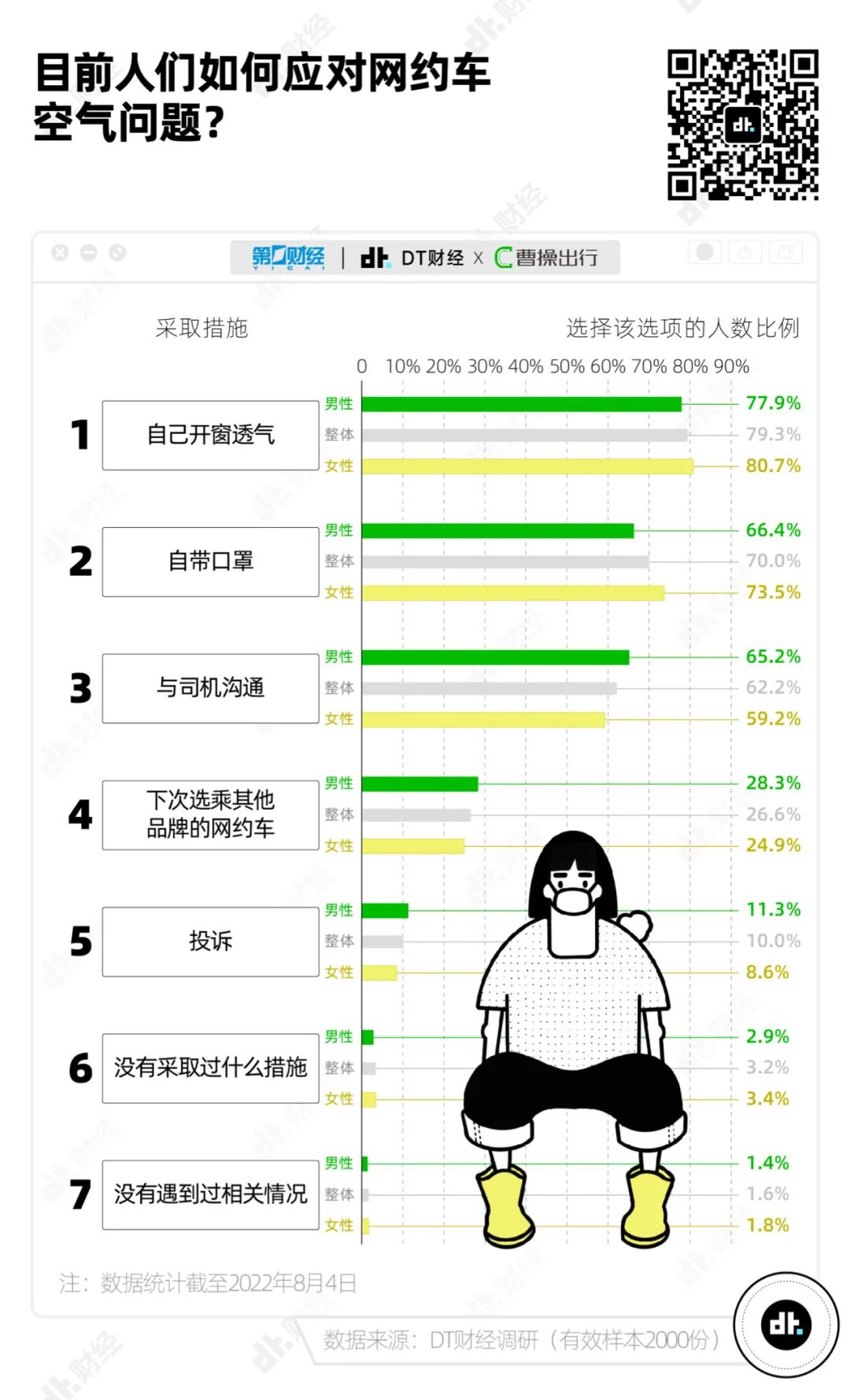 在回答“面臨網約車的空氣問題,你採取過哪些措施”這一問題時,79.3%的人選擇“自己開窗透氣”,70%的人“自帶口罩”,也有超過6成人表示自己會主動“與司機溝通”。只有差不多1/10的乘客會選擇投訴。
