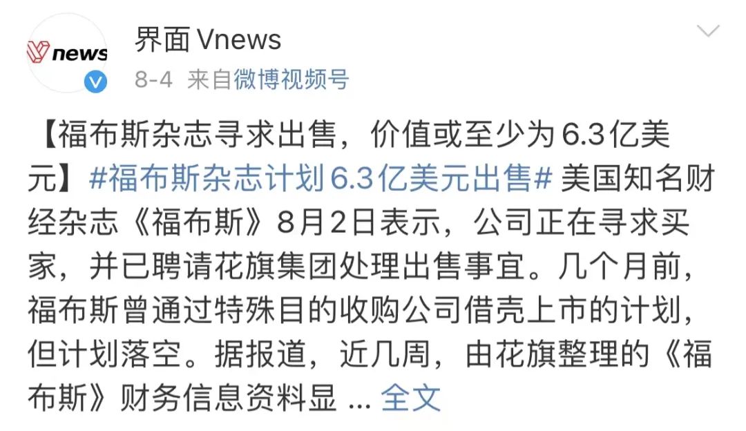8月初,有媒體報道,《福布斯》正在尋求買家,要價至少為6.3億美金。