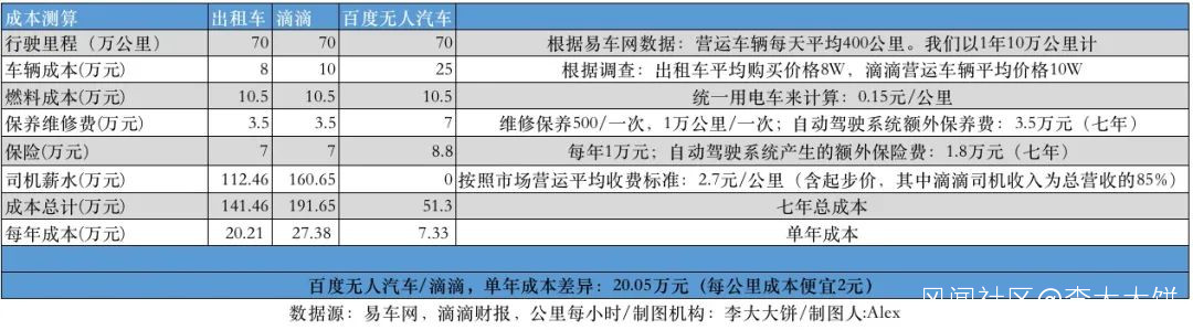從結果上你會發現,如果按運營時 2.7/公里的收費價格來算,百度無人車的每個 “ 運營單位 ” 的成本,相較於滴滴,每年少了 20.05 萬元,每公里少了 2 元。