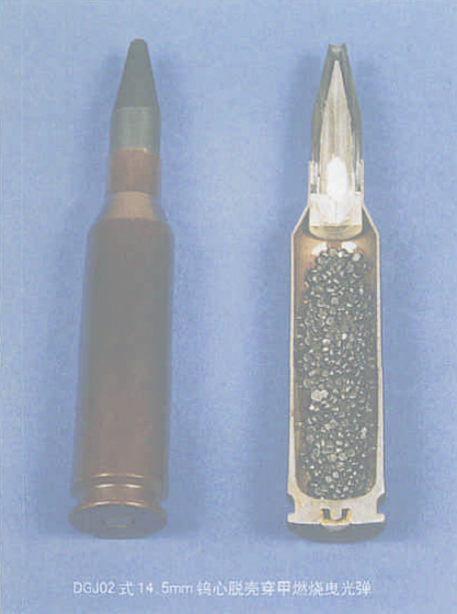 後來解放軍給14.5mm高射機槍也搞了鎢芯脱殼穿甲彈,比如DGJ02式14.5mm鎢心脱殼穿甲燃燒曳光彈,這玩意能夠在1000m處以 50°着角擊穿20mm厚的均質合金鋼板,放眼世界在14.5mm彈裏這簡直是離譜的,你説它是彈吧,卻有着和20炮相當的穿甲能力。
