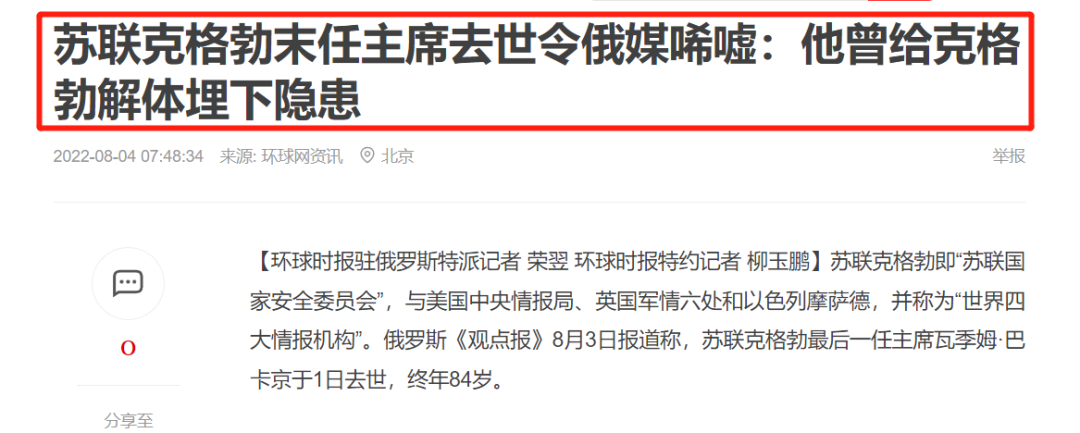 俄羅斯媒體報道,蘇聯克格勃最後一任主席瓦季姆·巴卡京8月1日去世,終年84歲。