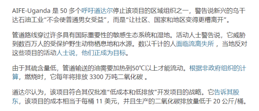 阿爾伯特湖有5000多平方公里,比青海湖還大,但是周邊人口密集,非常依賴漁業。要把石油運出來,必然要向東運輸,途徑尼羅河源頭維多利亞湖,一旦漏油,可能影響上千萬人的生存。而且新油田的含硫量低,必需建一條世界上最長的加熱管道保證管道運輸過程中內部温度保持在50度以上,避免石油凝結。這明顯增加了碳排放量,也增加了項目的複雜性,所以環保組織和本地的漁民一直要求項目提供更可靠的安全保證。現在看來技術和政治兩方面都解決問題了。