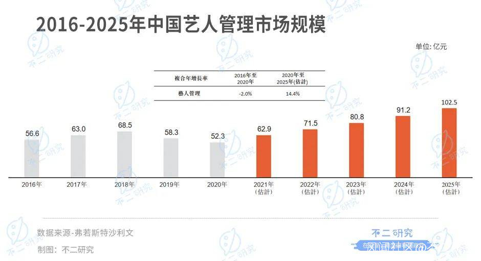 由於疫情影響,2019年中國藝人管理市場的規模開始呈走低趨勢,由2018年的685億元降至2019年的583億元,2020年再降至523億元。雖然在往後幾年預計會有回升,但是疫情加之限薪令的影響,未來是否會有新的變化尚未可知。