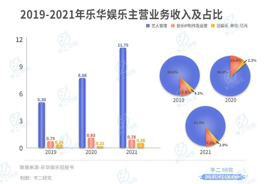 雖然樂華娛樂2019-2021年營收和淨利逐年增長,但收入結構相對單一、高度依賴於頭部藝人管理。以2021年為例,樂華娛樂營收12.90億元,其中來自藝人管理的營收為11.75億元,當期營收佔比高達91.0%。