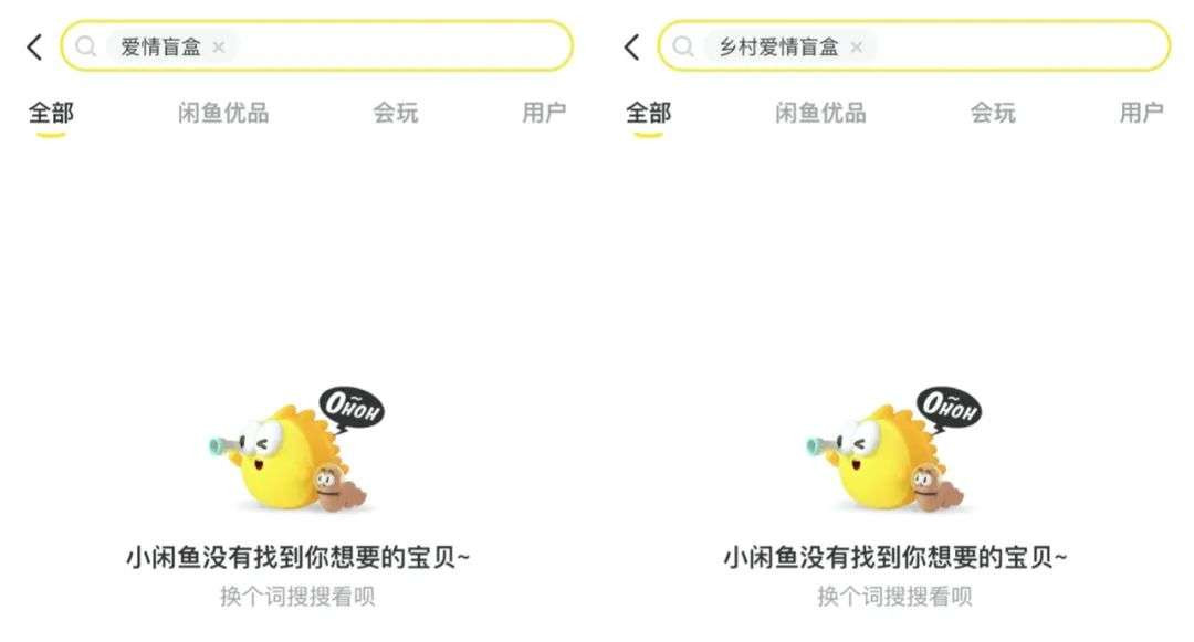 閒魚主要是通過不斷將違禁商品相關詞彙和暗語劃入違禁詞,對商品進行審核、屏蔽和下架。暗語多是普通詞彙,不斷將這些普通詞彙劃入違禁詞庫,正常商品的曝光就無可避免地受到影響。例如有色情服務將暗語設置為“愛情盲盒”,當閒魚將此暗語劃入違禁詞庫後,含有該詞彙的“鄉村愛情繫列盲盒”這一詞條也無法檢索,相關商品自然沒有曝光量。