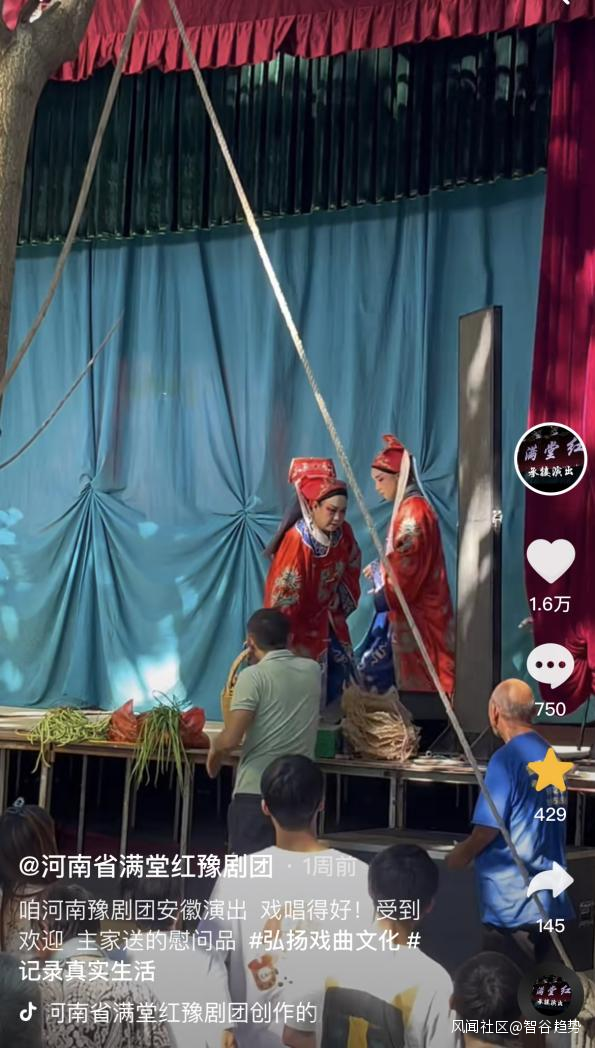 還有河南省滿堂紅豫劇團的一條短視頻,記錄了豫劇演員去安徽演出,演出結束後舞台上壘着“戰利品”,原來是淳樸的鄉親們送來了蔬菜、肉、油和米,給演員們做大鍋飯用。