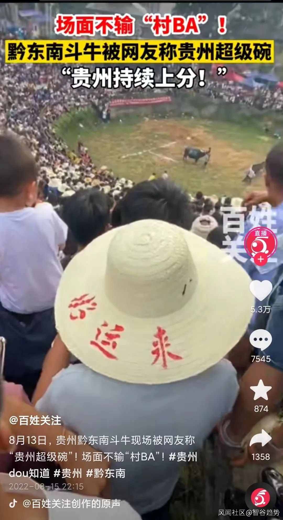 這不,貴州“村BA”火出圈後,貴州人初嘗互聯網流量紅利,也意識到了這種破圈模式的可行性,於是“持續上分”,緊鑼密鼓將黔東南鬥牛搬上了短視頻平台和直播間。