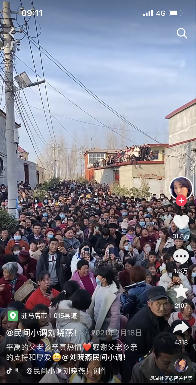 民間小調劉曉燕發了一條去駐馬店平禹演出的視頻,畫面裏村子被擠得水泄不通,房頂都站滿了粉絲。這條視頻收穫了31.8萬贊。