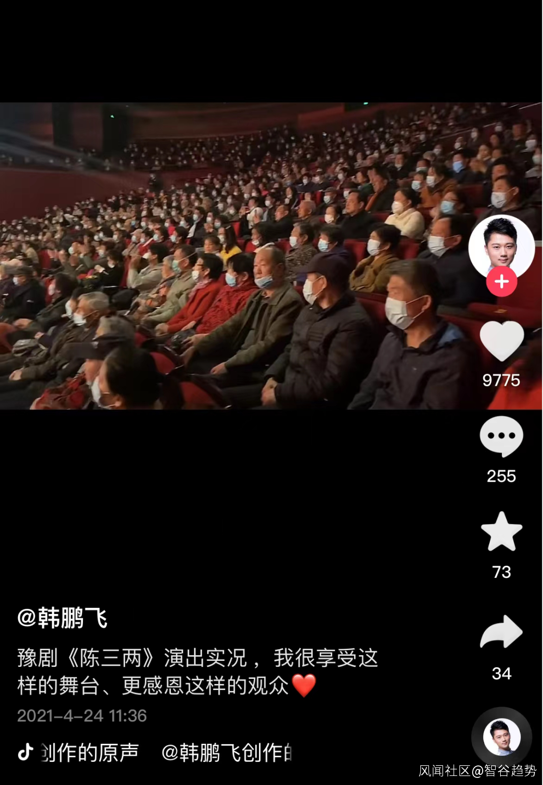 青年豫劇演員韓鵬飛一次線下演出《穆桂英掛帥》《秦雪梅》,發現近三分之一的觀眾,是從抖音直播間走進劇場的。網友從線上走到線下,他們不僅是線上的喝彩者,也成了劇場裏的觀眾。