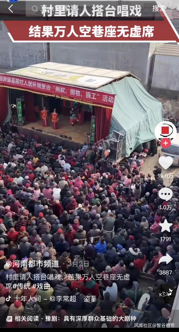河南某村請人搭台唱戲,十里八鄉老鄉全來了,全是黑壓壓的人頭,這才叫萬人空巷。