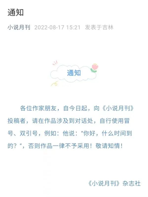 17. 《小説月刊》發通知:投稿者自行使用冒號、雙引號