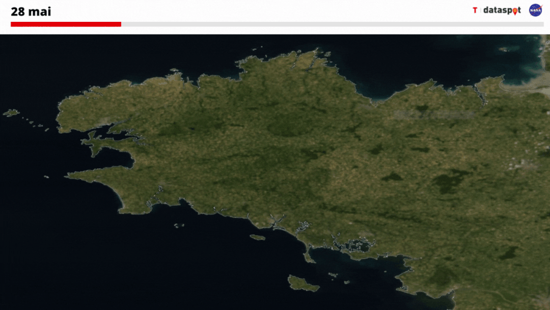 然而,持續乾旱導致天然牧場嚴重退縮。在今年的衞星雲圖上,從5月28日到8月7日,不到3個月的時間內,布列塔尼肉眼可見地從草綠色一步步變成了枯黃色,變化觸目驚心。
