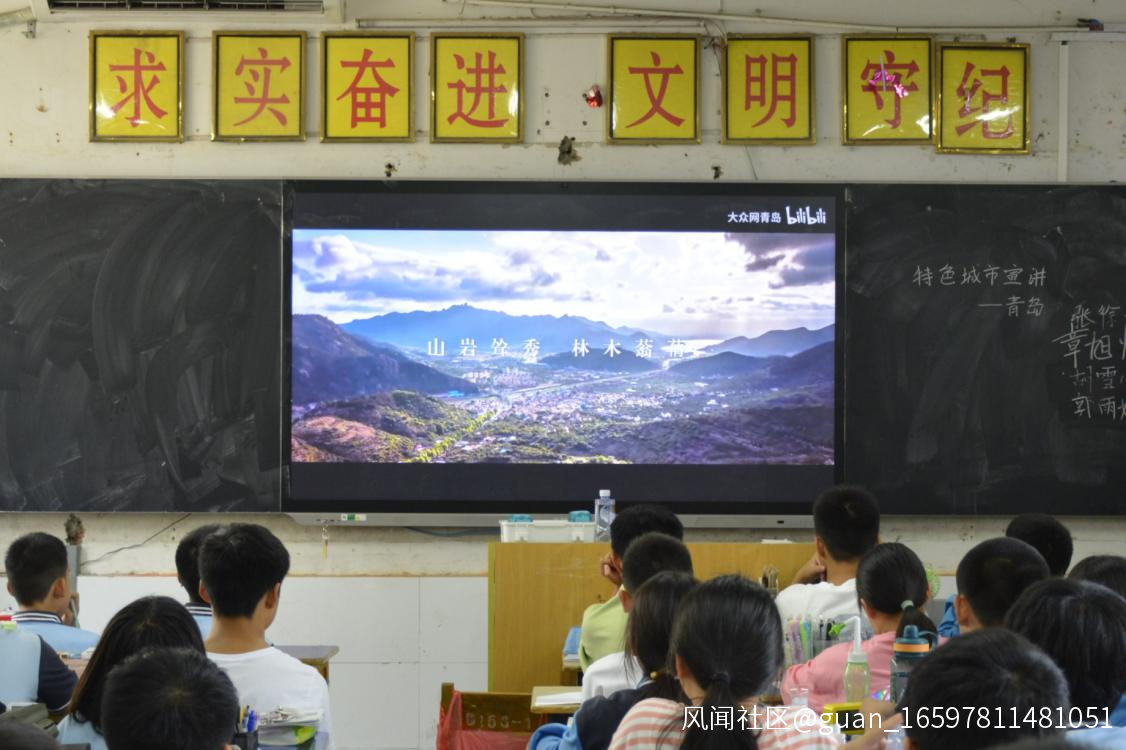 隊員王馨葒以幾道謎語導入課堂內容。“誇誇其談是哪座城市?”“海口!”“千里戈壁?”“長沙!”“那海上綠洲是?”這時,同學們就有些糾結了,大家小聲討論着,沒有人説出正確答案。“老師給大家一點提示,這是一座山東的城市。”“山東,青島!”大家一起大聲喊出這座城市的名字,課堂的氣氛也被調動起來。隨着隊員的講解和青島相關影像的放映,同學們對青島這座城市有了初步瞭解:紅瓦、綠樹、碧海、藍天輝映出青島美麗的身姿,赤礁、細浪、彩帆、金沙灘構成青島亮麗的海濱風景線,歷史、宗教、民俗、鄉情、節日慶典賦於青島豐富的旅遊內涵。同學們彷彿置身青島,感受歷史與現代文化交融,體會這座城市獨特的風土人情。