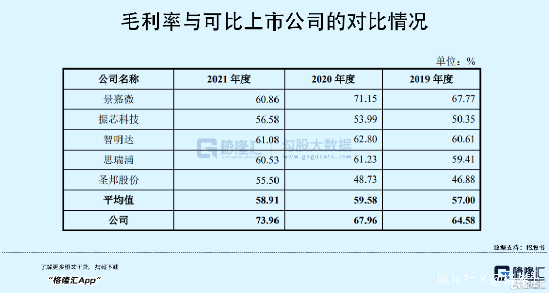 報告期內,公司自產產品銷售數量從2019年的38.90萬塊增長至2021年的81.42萬塊,規模的快速擴大使得公司生產效率有所提高,單位成本大幅下降,因此自產產品的毛利率逐年提升。報告期內,公司主營業務毛利率由64.58%上升至73.96%,整體高於可比上市公司平均水平(不足60%)。