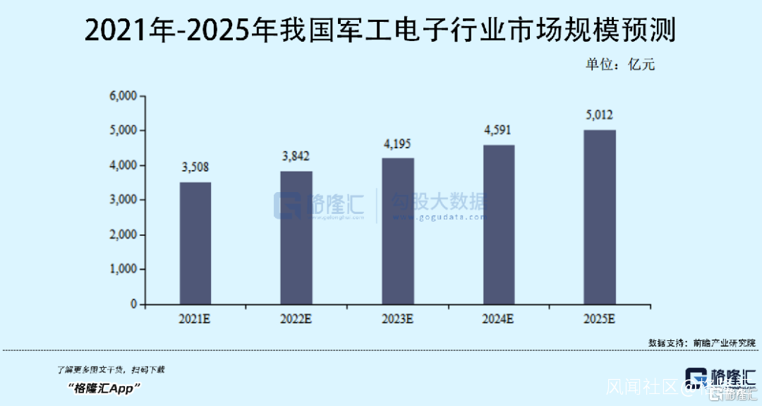 據統計,“十三五”軍費預算支出較“十二五”期間增幅近50%, 我國2021年軍費預算為1.35萬億元,已連續五年超萬億元;根據前瞻產業研究院的測算,2021-2025 年,我國軍工電子行業市場規模預計將以9.33%的年均複合增速增長,2025年將達到5012 億元。