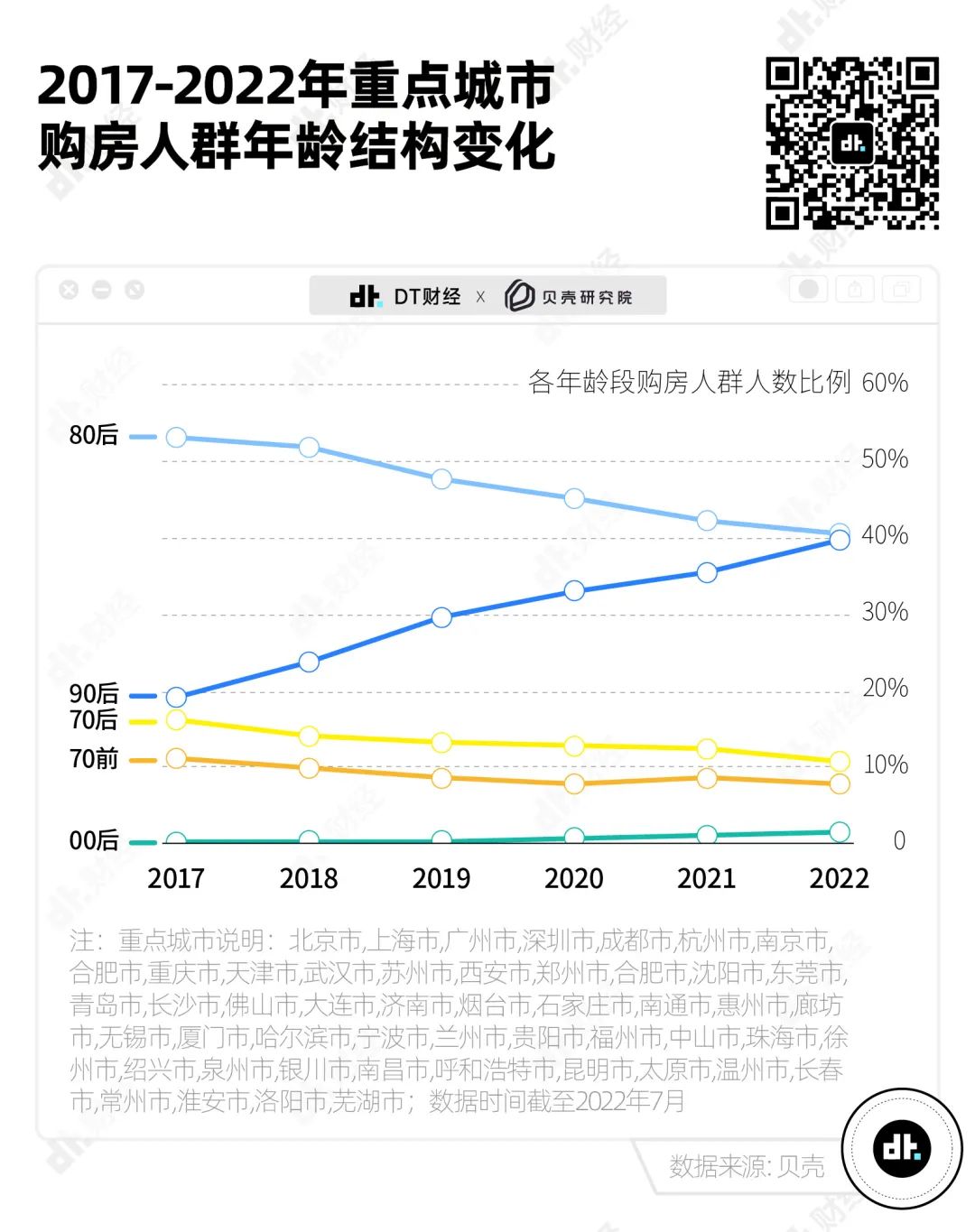 根據貝殼研究院的數據,在過去6年的時間裏,全國重點城市購房者中90後的比例上升相對顯著,大多數城市購房羣體年輕化趨勢明顯。