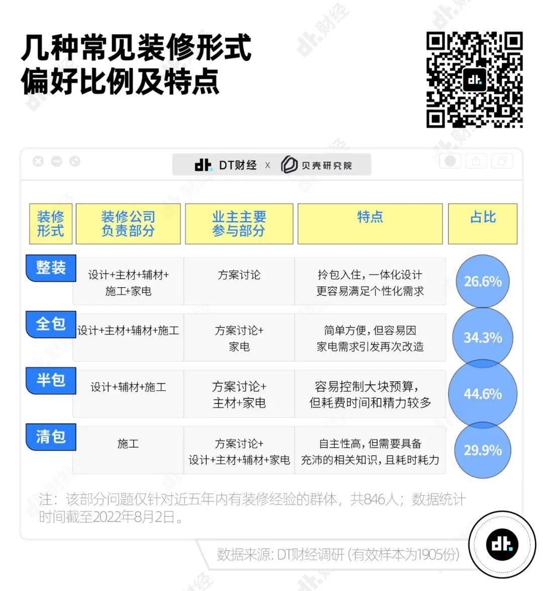 從裝修選擇來看,目前主流的裝修模式分別是:整裝(26.6%)、全包裝修(34.3%)、半包裝修 (44.6%)和清包裝修 (29.9%)。全程 DIY 裝修(13.7%)雖然自主性高,但因為特別麻煩、專業門檻高,選擇的人較少。