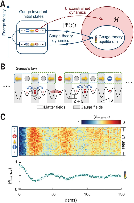 最近,中國科學技術大學潘建偉院士、苑震生教授等人與德國海德堡大學、奧地利因斯布魯克大學、意大利特倫託大學的研究者合作,首次實現了這樣的量子模擬。基本結論是:在某些類型的規範場論裏,確實會發生熱平衡。