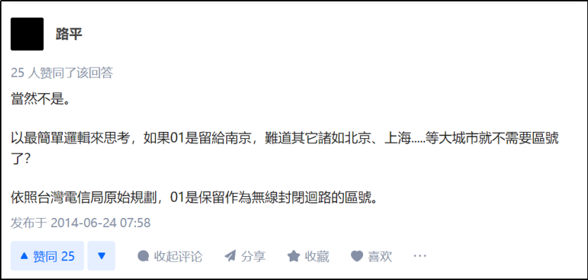 有人質疑此説法的真實性,他們認為01不使用出於技術原因,因為這是無線封閉迴路的區號。