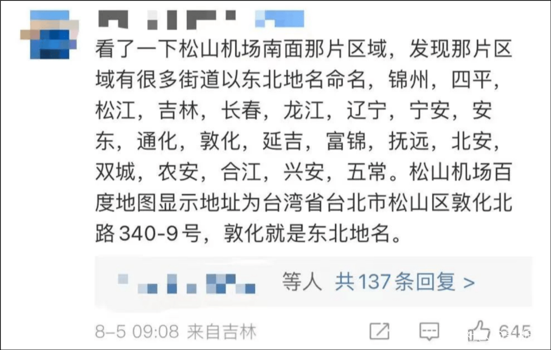 比如台北松山機場南面的一片區域,聚集了東北的地名。