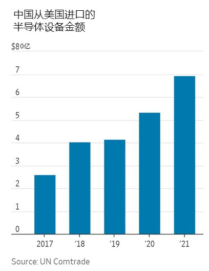 商務部也已經不再控制更成熟的技術,如一些半導體設備製造工具,這些工具對製造軍用和民用芯片都很關鍵。聯合國彙編的中國貿易數據顯示,2021年從美國進口的此類設備從2017年的26億美元上升到69億美元。