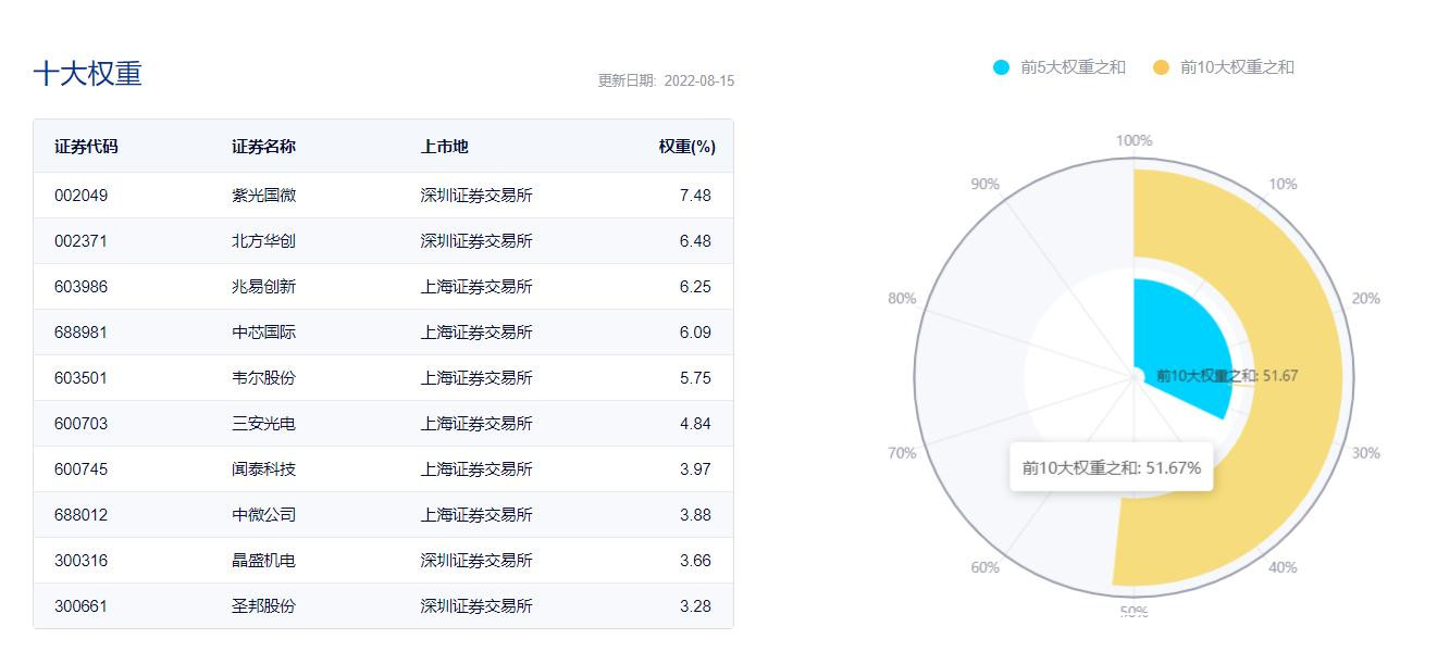 中證芯片產業指數的前五大重倉分別為紫光國微(002049.SZ)、北方華創(002371.SZ)、兆易創新(603986.SH)、中芯國際(688981.SH)、韋爾股份(603501.SH),截至8月15日,佔比分別為7.48%、6.48%、6.25%、6.09%、5.75%,前十大重倉佔比合計51.67%。