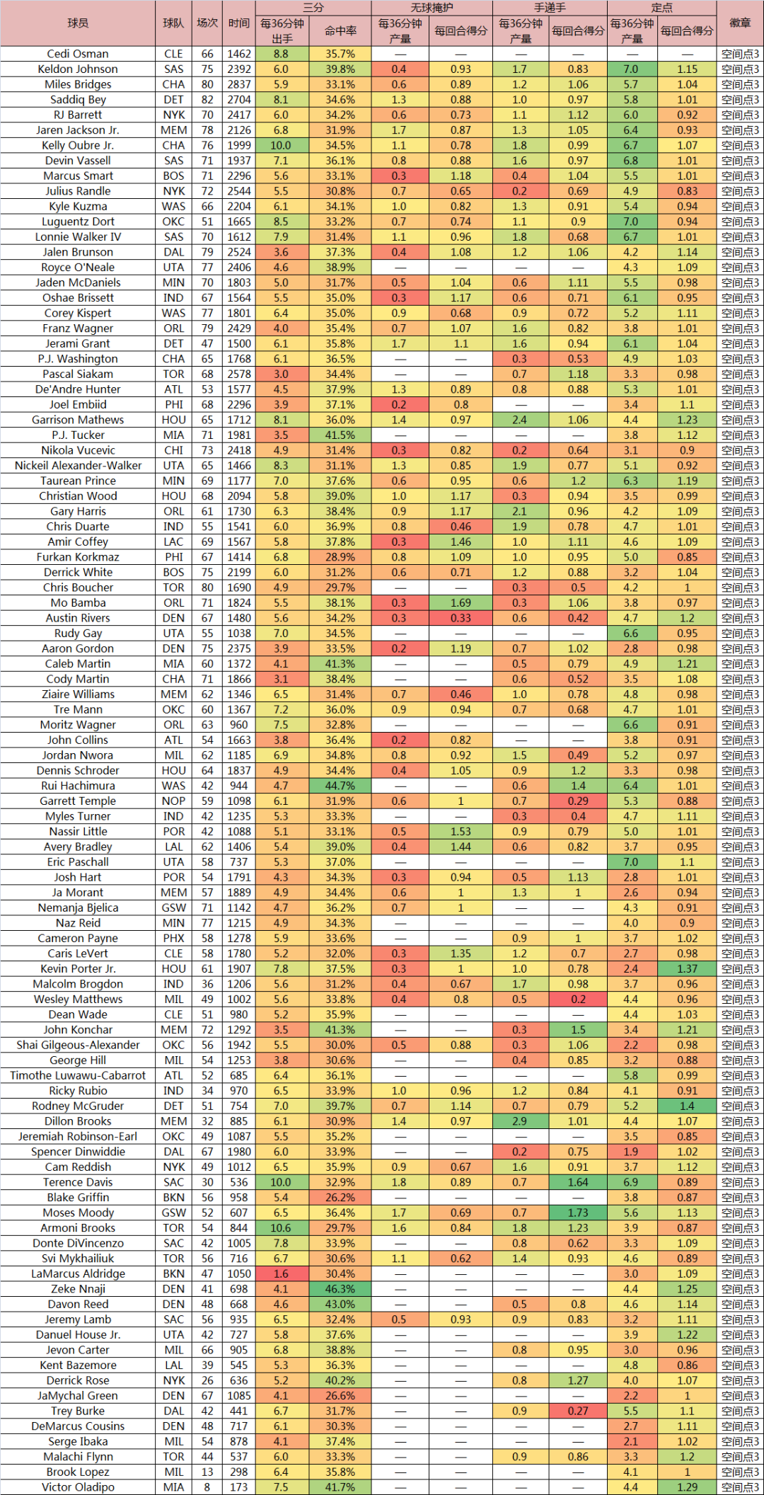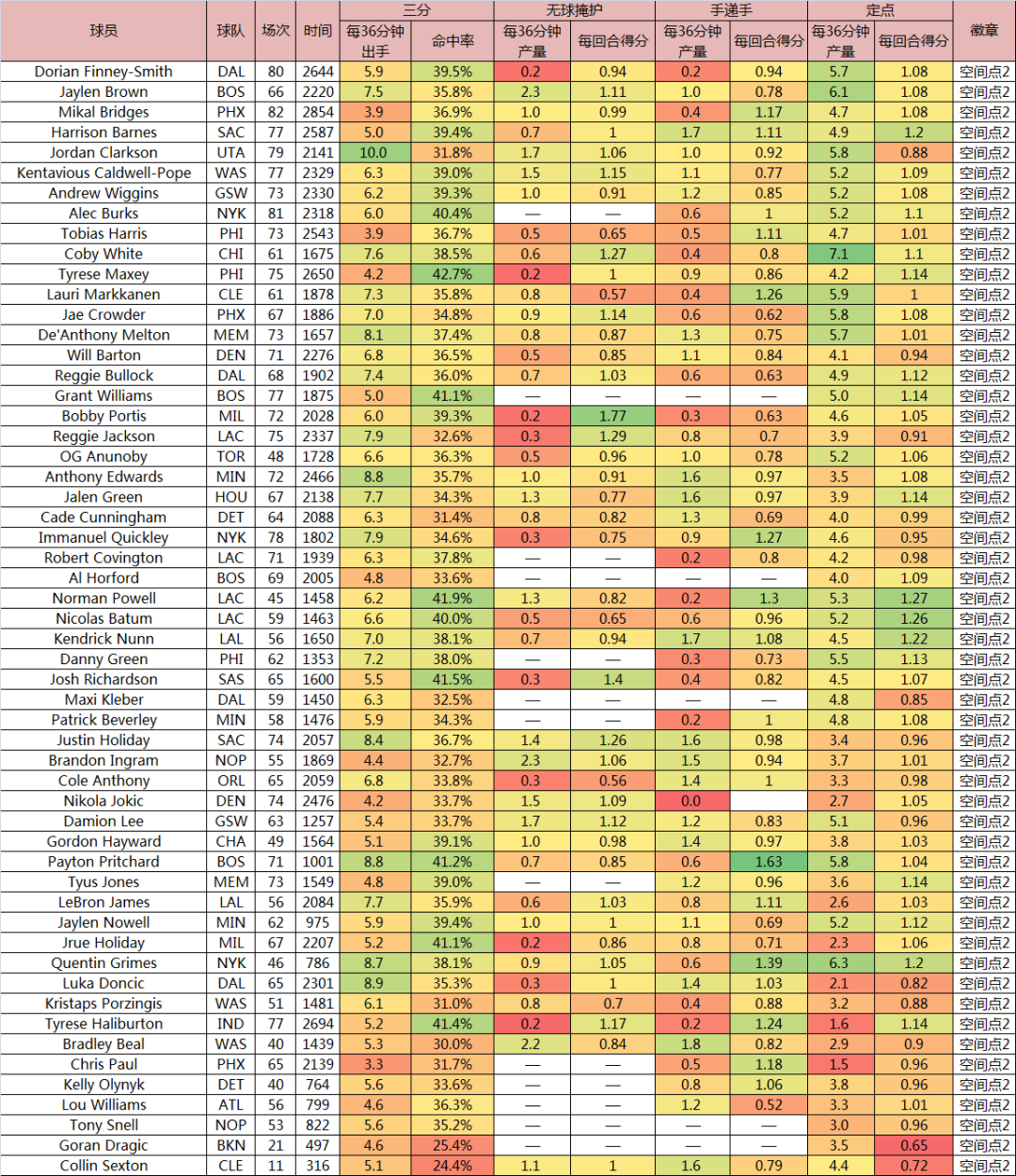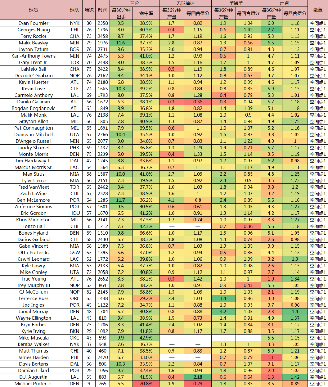 還有一些外線球員的投射表現在“空間點3”級別徘徊,不好界定哪個球員可稱“空間點”的下限,畢竟,外線配角不管準不準,總會投幾個,都是NBA球員,產量低的情況下,單賽季準一下不稀奇。一般來説,現在準或者曾準過一段時間的,能放進來就儘量放了,但一些球員生涯履歷沒一個賽季三分產效合格,的確就沒法放進去,比如,德章泰·穆雷。