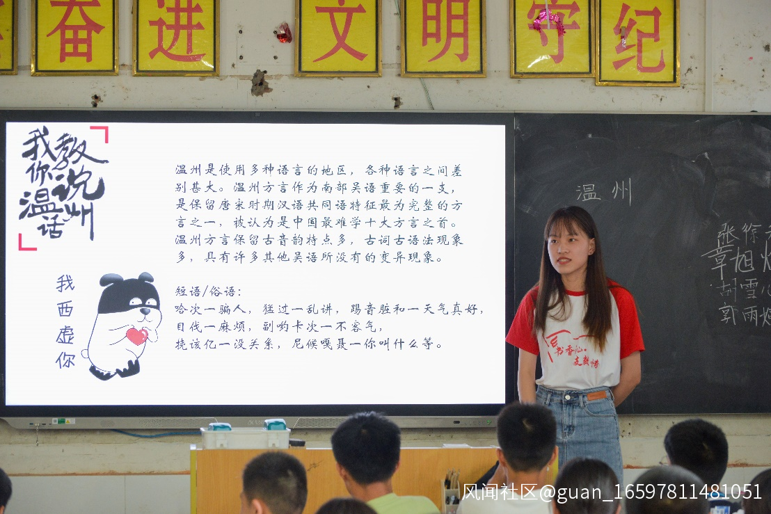 除了介紹温州的景色和文化以外,在這樣一節特色城市宣講上,我也為孩子們介紹了温州的大學,希望能在孩子們幼小的心靈裏種下一顆種子,給孩子們帶去希望,一顆種子會慢慢發芽,最後長成參天大樹。我望着他們閃爍的眼睛,看着他們充滿渴望的眼神,我在他們身上看到了那顆種子在悄悄發芽。世界很大,我希望他們能到處看看,就像《天堂電影院》裏説的那樣:“如果你不出去走走,你就會以為這就是世界。”世界很大,總要去各地走走,我希望他們能夠熟讀百書,也能走遍各地,看看祖國的大好河山。