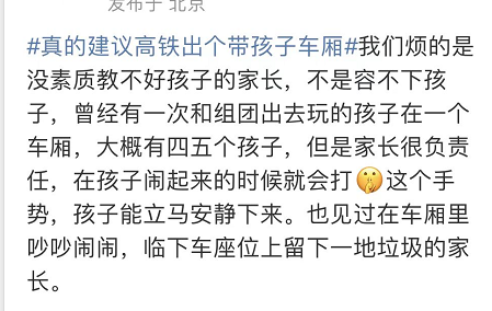 8月14日,北京一高鐵上,一名3歲兒童因吵鬧聲音過大、時間持續長,被同車旅客勸説制止,不料卻遭到孩子家長的怒懟和辱罵,甚至説出“我的孩子我管不好,我控制不了他!”、“嫌吵你們坐高級的去”這類不負責任、蠻不講理的話。