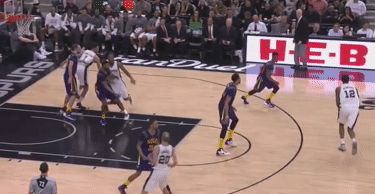 看完上面這個球,看下面就有趣了:吉諾比利上線傳韋斯特,韋斯特轉移到右翼,內線博班也往右側去,牽動對方防守;吉諾比利佯裝橫走,眼看要接韋斯特的二人轉,對位吉諾比利的是老馬刺貝里內利,知道這套路,預備擋吉諾比利,吉諾比利變招,內切抄後門。