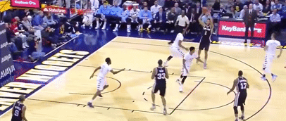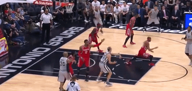 這個套路當然有變招。比如這個球,對面咬死執行人盯人,於是阿爾德里奇上線,和帕克做遞手假動作,利用格林和萊納德的雙擋內切。此時馬刺右側四人堆疊。
