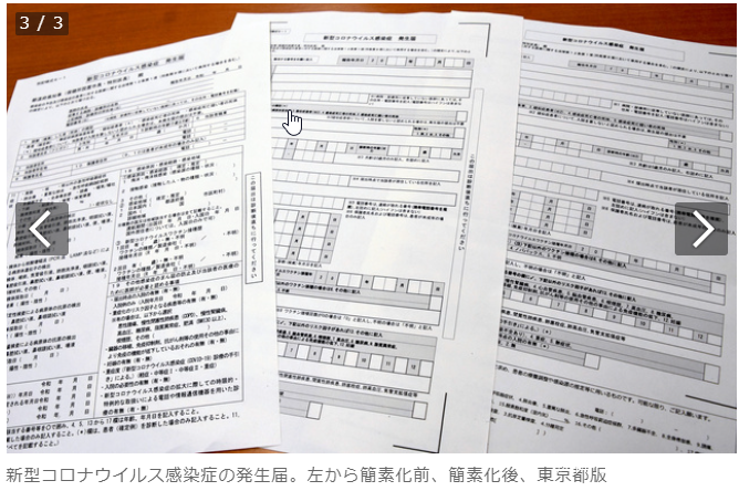 媒體披露的東京都確診患者登記表格。左為迄今為止的詳盡版,右為今後的簡化版